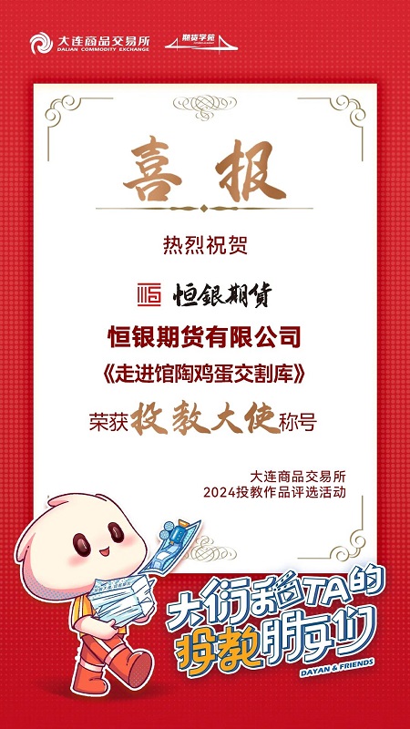 近日,由大連商品交易所舉辦的“大衍和TA的投教朋友們”——2024年大商所投教作品評選活動圓滿落幕。經(jīng)過激烈的角逐和嚴(yán)格的評審,國富公司所屬恒銀期貨有限公司(以下簡稱恒銀期貨)憑借《走進(jìn)館陶雞蛋交割庫》的投教視頻作品,成功榮獲“投教大使”稱號。